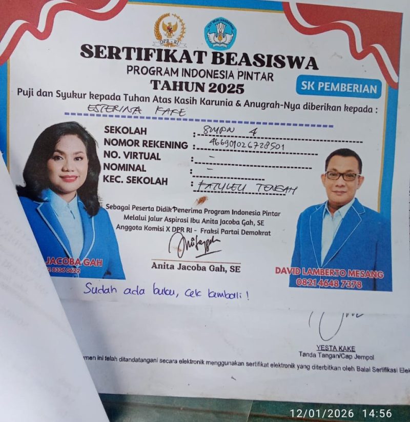 Kisah ini bermula ketika Yesta mendatangi Rumah Aspirasi Anita Jakoba Gah, SE, Anggota DPR-RI, untuk mendaftarkan anaknya Esterina Kake sebagai penerima beasiswa PIP melalui jalur aspirasi tahun 2025 kemarin.